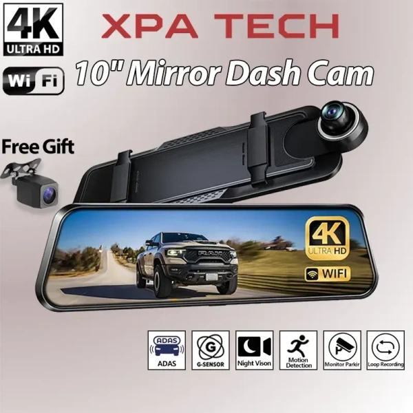 10 Inch 4K Mirror Dash Cam ADAS Dual Lens Front Rear Camera WiFi Touch Screen 4K+1080P Night Vision Loop Recording 128GB SD Car DVR
