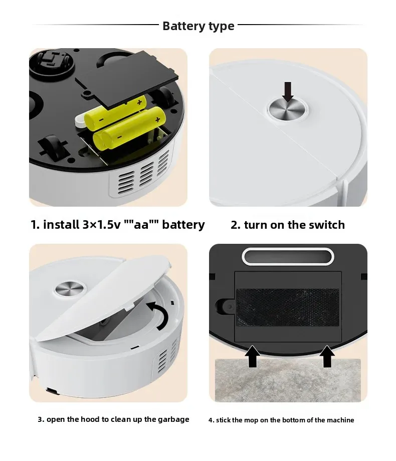 The Robotic Vacuum Cleaner is your ultimate home cleaning assistant. Designed for daily dust and debris removal, this compact and smart cleaner is easy to use — simply install 3 AA batteries, turn on the power switch, and watch it glide around your room collecting dust, pet hair, and crumbs.