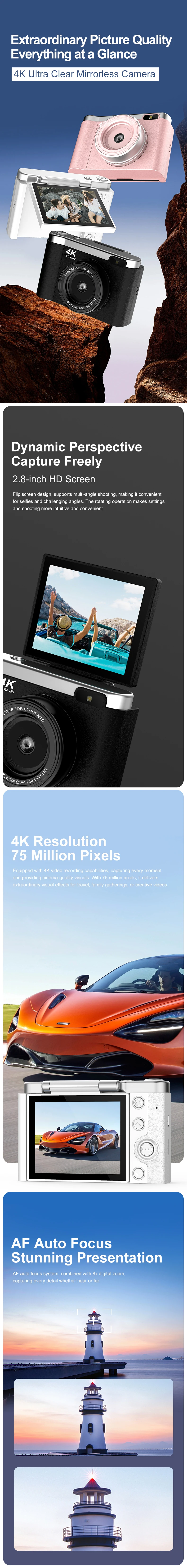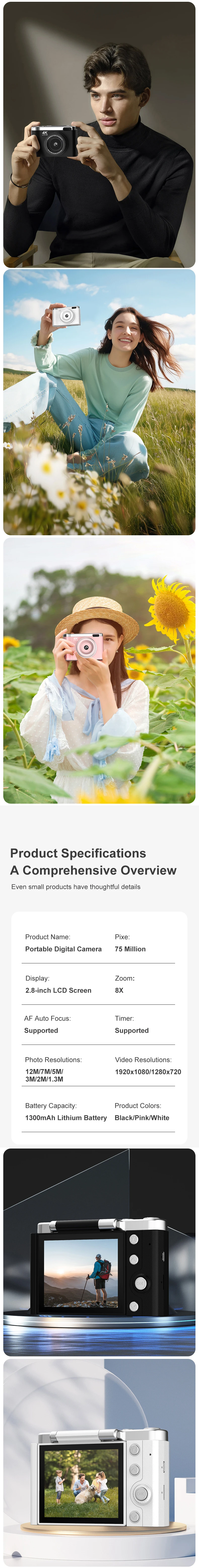 The Digital Camera with 2.8″ 180° Flip Display is designed for users who want an easy-to-use camera for selfies, vlogging, and everyday photography. The flip-up screen allows you to frame shots accurately from the front, making it ideal for content creation, video diaries, and travel memories.