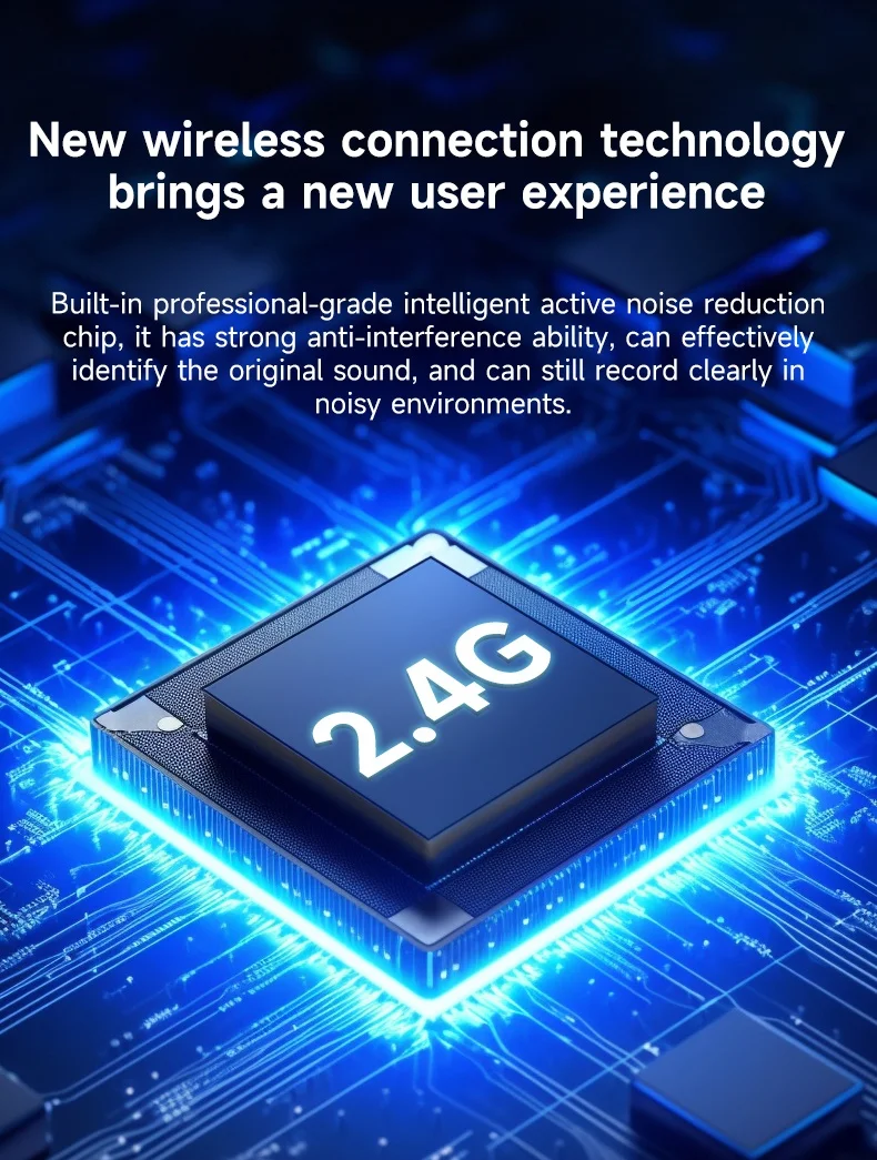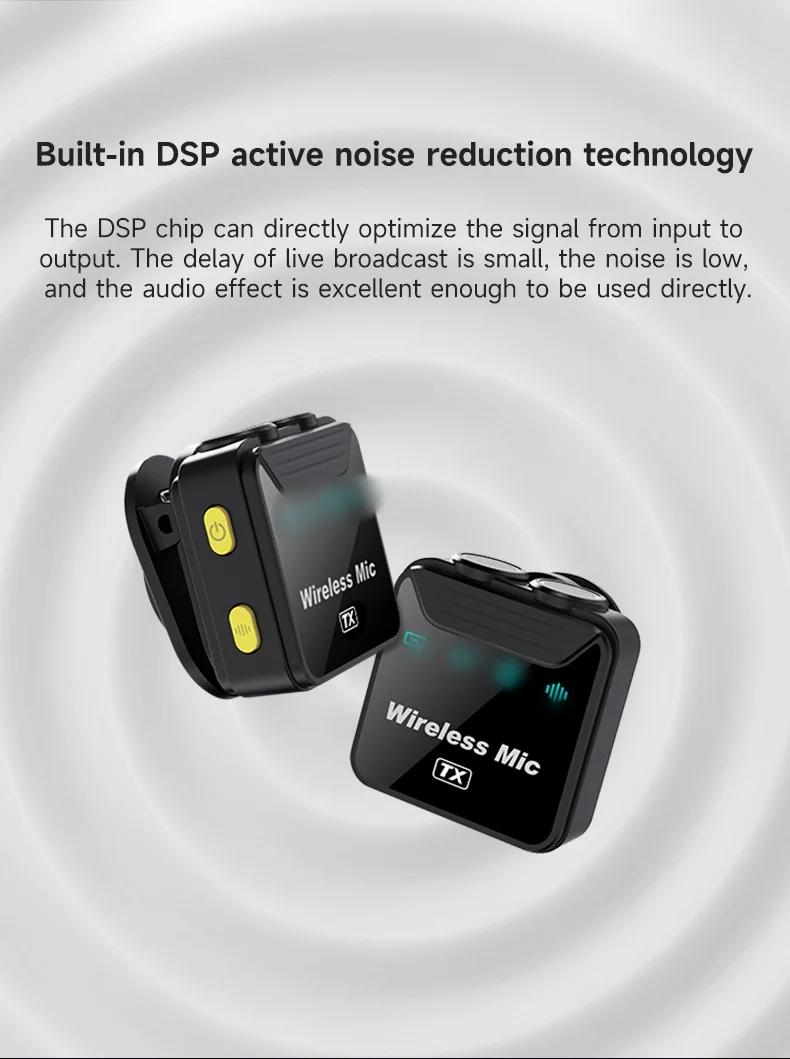 It operates on a reliable 2.4 GHz wireless frequency, offering robust performance and a practical working range of around 20 meters in open, unobstructed environments. The system features high-performance DSP-based noise reduction with three adjustable levels, ensuring that background interference like wind, chatter, or electronic hum does not compromise the clarity of the recorded voice.