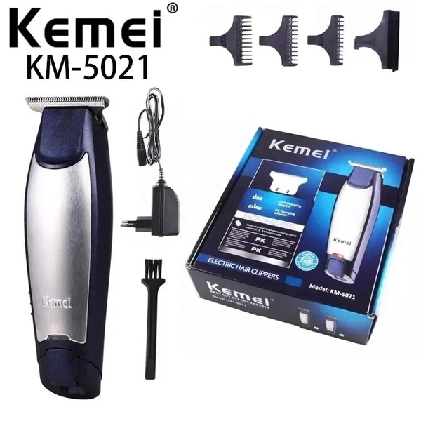 The package typically includes the Kemei KM-5021 hair clipper, multiple comb attachments, cleaning brush, USB charging cable, and user manual.