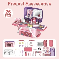 Includes toy lipstick, mirror, brush, and other makeup accessories (varies by pack). -